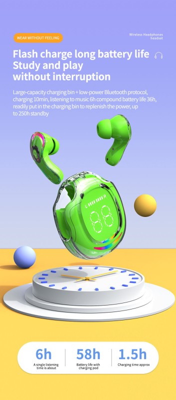 Translucent Headset with Microphone In-Ear Headphones with Charging Case TWS Wireless Earbuds Earphone